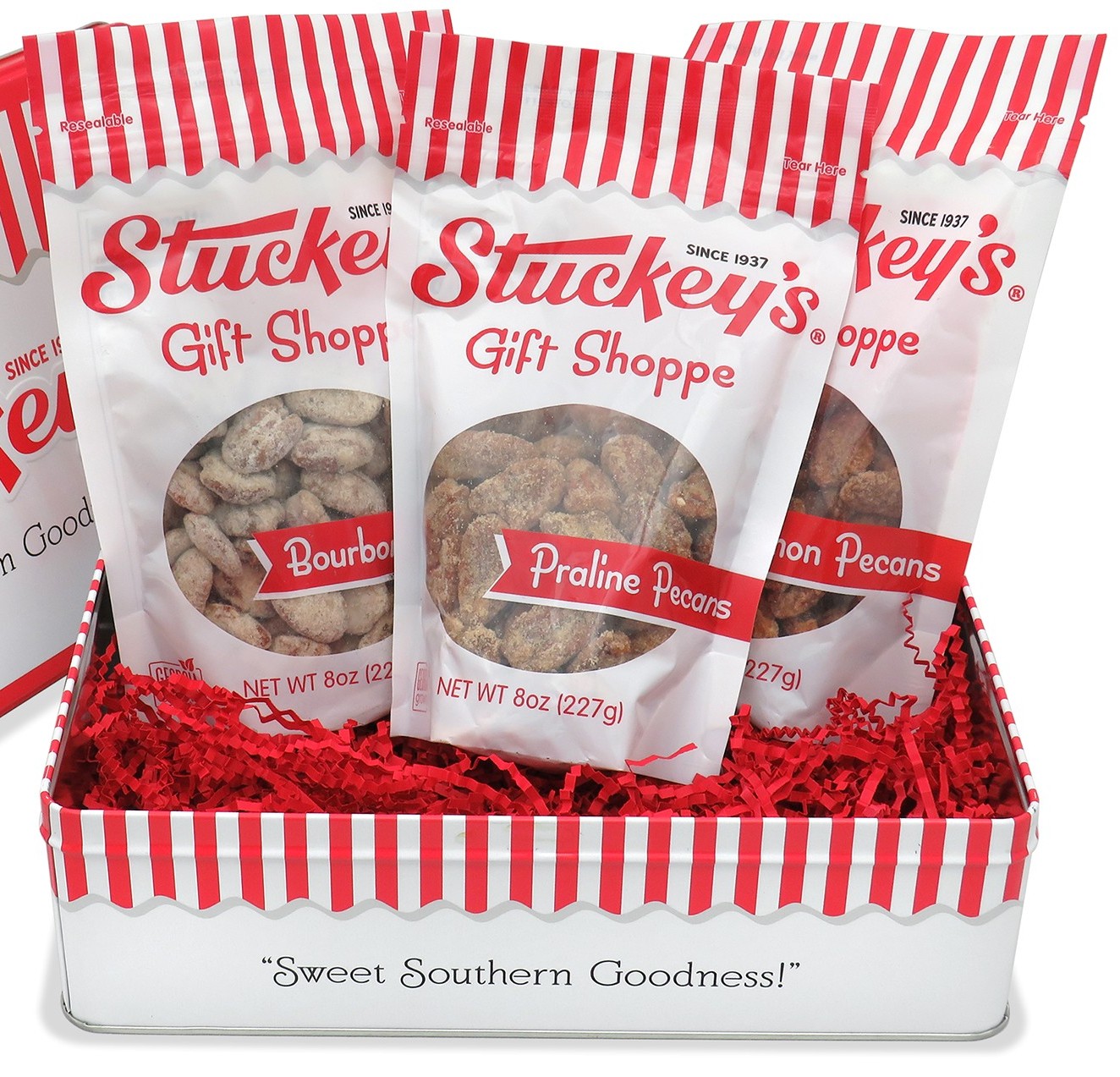 Three bold Southern classics, one unforgettable tin featuring our Bourbon, Praline, and Cinnamon Pecans—each in a generous 8oz bag.